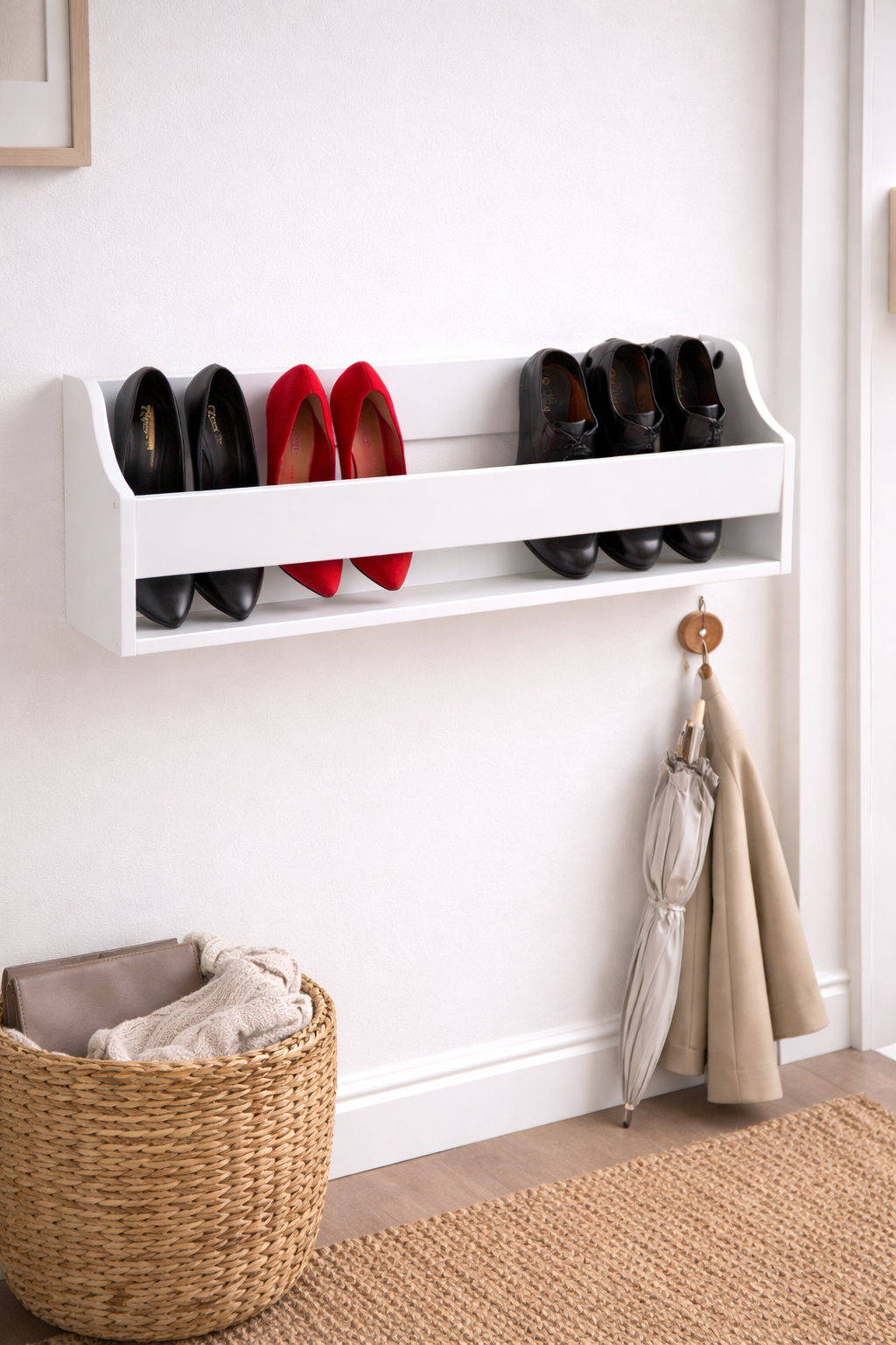 This wall-mounted shoe rack isn’t just about looks. Designed for everyday use, it features: